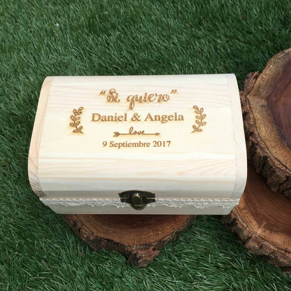Bonito baúl de madera natural decorada con encaje de bolillos, interior con cojín de yute y grabado láser. Perfecta para llevar las alianzas, las arras… Se personaliza. Modelo si quiero. Opción de poner un nombre o ambos. Precio unitario.